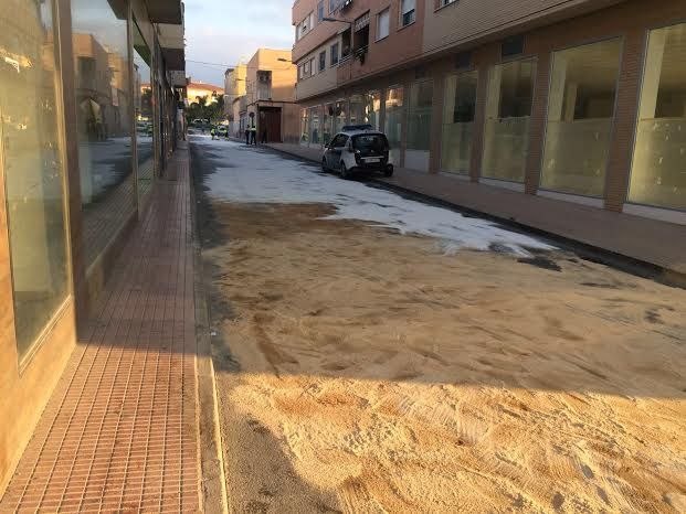 Al parecer, una avería en el sistema hidráulico del vehículo ha podido causar el desbordamiento del gasoil a lo largo de toda la calle.