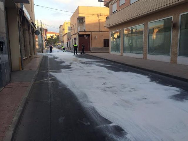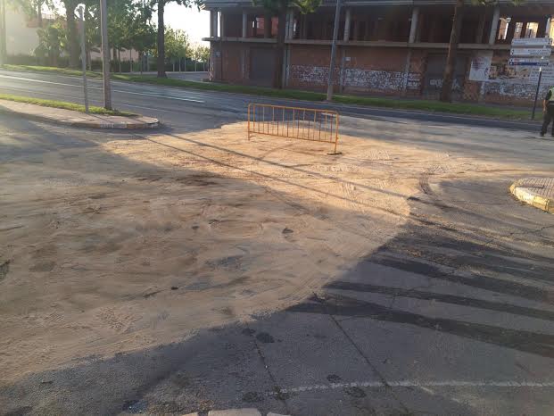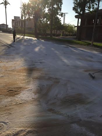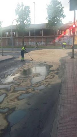 Los operarios de la brigada de limpieza han vertido grandes cantidades de serrín y yeso para que se absorbiera el combustible desde la rotonda del "Donante de Sangre" hasta la denominada "Alfonso Navarro, junto al Pabellón de Deprotes; y así proceder a su progresiva retirada de la calzada.