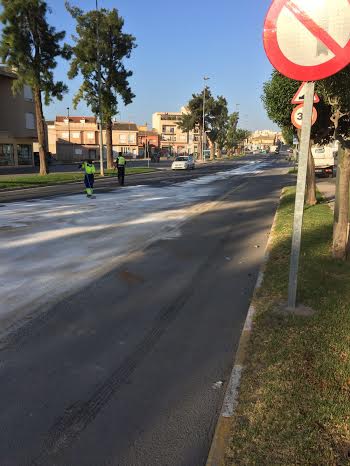 La avería de un camión ha provocado el derramamiento de combustible en la calzada de la calle Alhama, que ha obligado a cortar el tráfico durante varias horas esta mañana hasta que los operarios de la brigada de la Concejalía de Servicios a la Ciudad han solucionado el problema.
