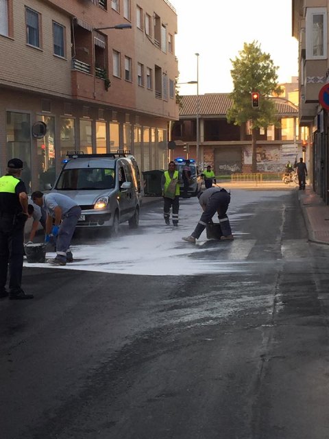Cuando hay alguna adversidad, aquí están los que siempre responden los trabajadores del almacén municipal y la policia local. Un escape no saben si de gasoil en la calle Alhama. Pedimos precaución.