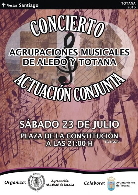 Las Agrupaciones Musicales de Aledo y Totana realizan una actuación conjunta este sábado, día 23 de julio, a partir de las 21:00 horas, en la plaza de la Constitución dentro del programa de actividades culturales de los festejos patronales de Santiago´2016.