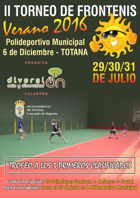 La Concejalía de Deportes informa de que los días 29, 30,31 de julio tendrá lugar en el polideportivo municipal 6 de diciembre el II Torneo de frontenis veraniego de Totana, en modalidad de parejas.