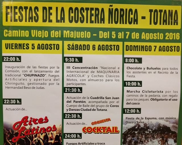 Las fiestas de La Costera-Ñorica se celebran del 5 al 7 de agosto en el Camino Viejo del Majuelo con un atractivo programa de actividades organizado por la Comisión de Fiestas de la Asociación de Vecinos de esta diputación, con la colaboración del Ayuntamiento de Totana.