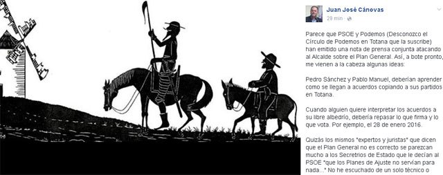 Parece que PSOE y Podemos (Desconozco el Círculo de Podemos en Totana que la suscribe) han emitido una nota de prensa conjunta atacando al Alcalde sobre el Plan General. Así, a bote pronto, me vienen a la cabeza algunas ideas: