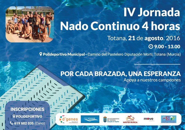 Esta actividad cuenta con el apoyo de la Concejalía de Deportes del Consistorio totanero, el Club Natación Máster Murcia, PROIDMAN, Move, D´Genes y AELIP.