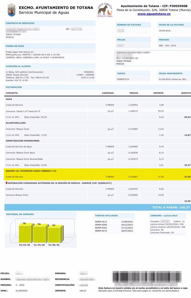 El Presidente de CEBAG debería revisar los recibos en los que se refleja la tasa exacta que se paga por la recogida de la basura en Totana, en lugar de dar unas cifras falsas y desorbitadas escudándose en un supuesto informe de la Universidad de Murcia. Demuestra un gran desconocimiento cuando se da por veraz cualquier informe externo, cuando simplemente con un recibo al alcance de cualquier vecino se puede comprobar fácilmente que esas cifras son incorrectas. Una familia de hasta 5 miembros, paga en Totana un total de 110€ anuales en concepto de recogida de residuos, muy lejos de los 360 que él afirma.