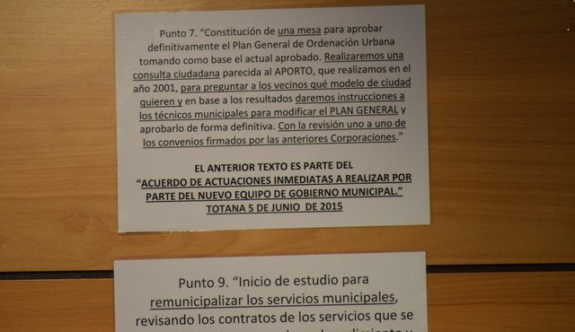 El pasado 5 de junio de 2015, los representantes de PSOE e Izquierda Unida suscribieron los principios programáticos del Programa de Gobierno para la legislatura 2015-2019, bajo el título “Programa de actuaciones inmediatas a realizar por parte del nuevo equipo de Gobierno Municipal (de Totana)”.