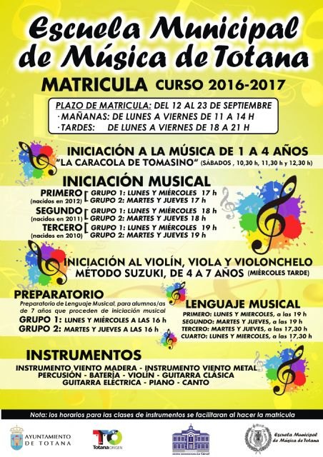 El horario para formalizar la matrícula es dentro de estas fechas de lunes a viernes, de 11:00 a 14:00 horas y de 18:00 a 21:00 horas, en la Escuela Municipal de Música, en el Centro Sociocultural “La Cárcel”.