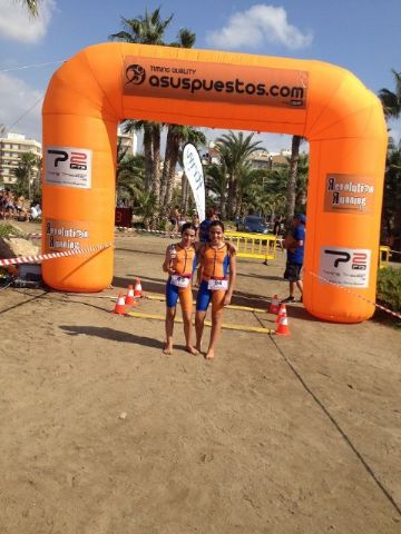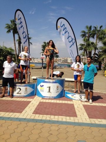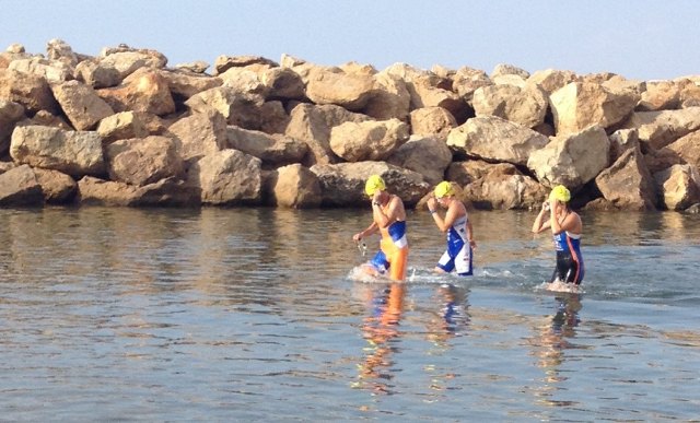Luego en la parte de los pequeños participaron en Alevines, donde el recorrido trascurría también por el mismo circuito de los mayores pero con menor distancia, 500 metros a pie, 200 de nado en el mar y otros 500 metros a pie, en esta ocasión las participantes fueron Noemí Caja y Miriam Caja que acabarían TERCERA Y CUARTA respectivamente y a escasos segundos de las primeras.