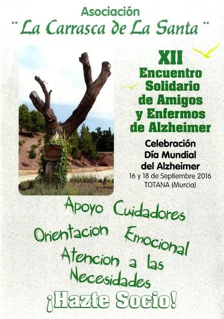La Asociación de Familiares y Enfermos de Alzheimer de Totana "La Carrasca de La Santa" (AFAT) celebra el XII Encuentro Solidario de Amigos y Enfermos de Alzheimer, del 16 al 18 de septiembre, coincidiendo con la celebración del Día Mundial de esta enfermedad declarado por la Organización Mundial de la Salud el próximo día 21.