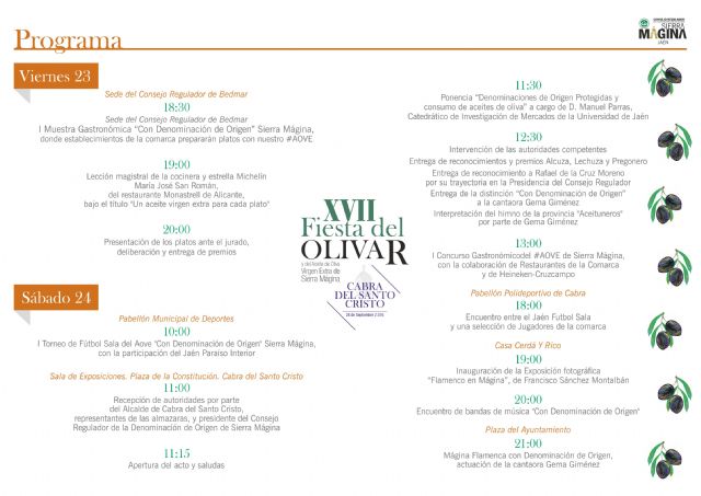 Como novedad, se ha diseñado un amplio programa de actividades en el que los caldos tempranos de Sierra Mágina brillarán con luz propia y se convertirán en los auténticos protagonistas de dos de las actividades previstas: la I Muestra Gastronómica "Con Denominación de Origen" Sierra Mágina (23 de septiembre, Sede del Consejo Regular en Bedmar), en la que establecimientos hosteleros de la comarca elaborarán tapas con aceite de oliva virgen extra "Sierra Mágina"; y el I Concurso Gastronómico del #AOVE de Sierra Mágina (24 de septiembre, Sala de Exposiciones de Cabra del Santo Cristo), en la que los amantes del aceite de oliva virgen extra y restaurantes de Sierra Mágina demostrarán sus dotes culinarias. Además el viernes 23, la cocinera y estrella Michelín Maria San Román, del restaurante Monastrell de Alicante, impartirá en la sede del Consejo Regulador en Bedmar, una lección magistral, en la que bajo el título "Un aceite virgen extra para cada plato", mostrará la versatilidad y potencial del virgen extra en la cocina. Además, formará parte del jurado de la muestra y del concurso gastronómico.