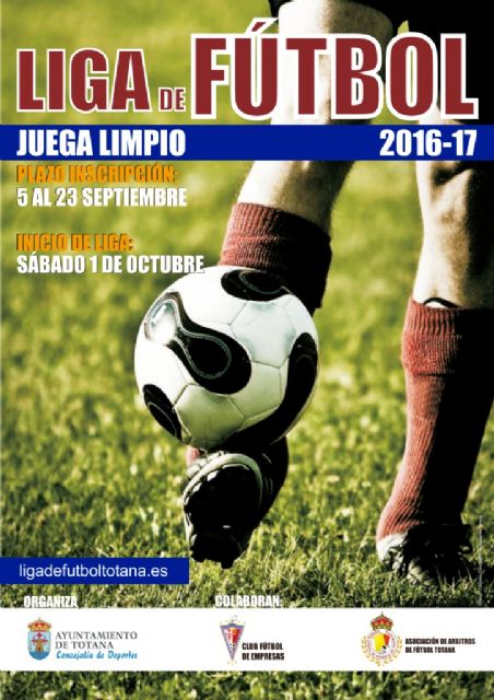Los equipos tienen hasta mañana para inscribirse en la Liga de Fútbol "Juega Limpio" en la temporada 2016/2017 que organiza la Concejalía de Deportes y que arrancará en el primer fin de semana de octubre, con la colaboración del Club Fútbol de Empresas y la Asociación de Árbitros de Totana.