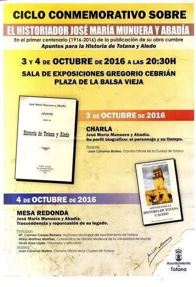 Las concejalías de Cultura y Archivo han organizado, con la inestimable colaboración del cronista de la ciudad, Juan Cánovas Mulero, un Ciclo Conmemorativo sobre la figura del historiador José María Munuera y Abadía con motivo del primer centenario de la publicación "Apuntes para la Historia de Totana y Aledo" (1916-2016).