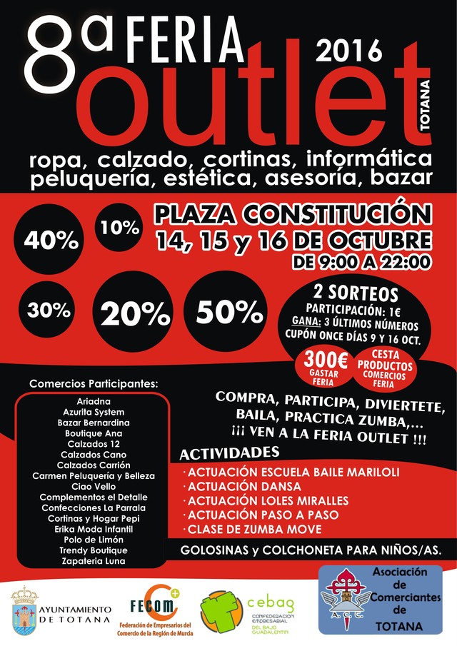 Habrá un sorteo de 300 euros de premio al ganador de la papeleta con el sorteo de la once del primer premio del día 9 de Octubre. Las papeletas son a 1€ y pueden comprarlas en los comercios participantes. Y otro sorteo de regalo una cesta de productos de todos los comercios participantes, cada comercio repartirá una cartulina que sellarán cada uno por una compra; cuando la cartulina esté totalmente sellada por todos los comercios participantes en dicha feria entrarán en el sorteo.