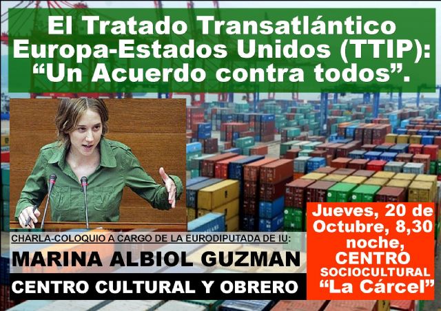 La Eurodiputada por IU Marina Albiol ofrecerá la Charla-coloquio "El tratado transatlántico Europa-Estados Unidos, (TTIP), "un acuerdo contra todos" el próximo jueves 20 de octubre a las 20:30 en en centro sociocultural "La Cárcel" , según informan desde el Centro Cultural y Obrero de Totana.