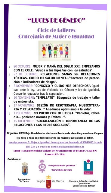 La Concejalía de Mujer e Igualdad ha organizado para este próximo trimestre el ciclo de talleres que lleva por título "Luces de género" con el fin de abordar soluciones a conflictos cotidianos que se desarrollan en el ámbito familiar y concienciar a la sociedad de la igualdad de género.