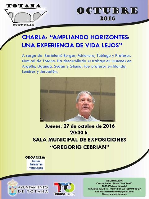 El misionero y teólogo totanero Bartolomé Burgos ofrece una conferencia el jueves, 27 de octubre, en la sala de exposiciones "Gregorio Cebrián", a partir de las 20:30 horas, organizada por el grupo de cultura "Encuentro y reflexión" y enmarcada dentro del programa "Totana Cultural" que promueve la Concejalía de Cultura.