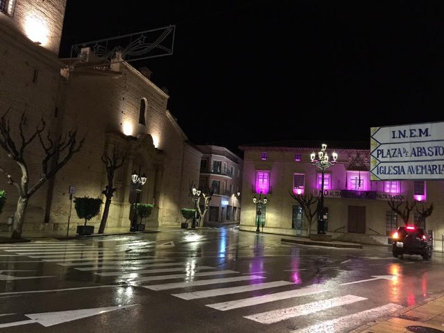 Esta noche, llueve y resalta la iluminación de la plaza con esos colores contra la violencia de género