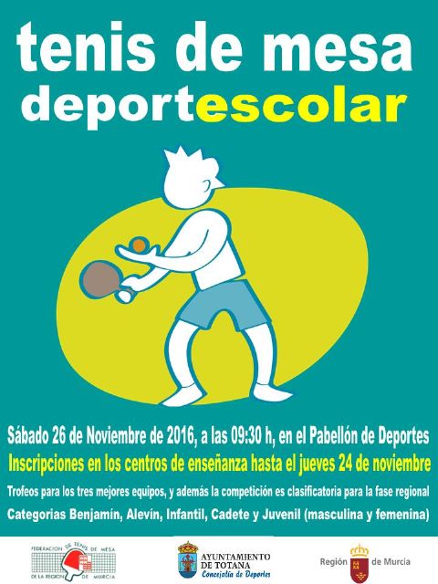 La Concejalía de Deportes tiene previsto organizar mañana sábado 26 de noviembre la Fase Local de Tenis de Mesa de Deporte Escolar, en colaboración con el Club de Tenis de Mesa, a partir de las 9.30 horas en el Pabellón de Deportes "Manolo Ibáñez".