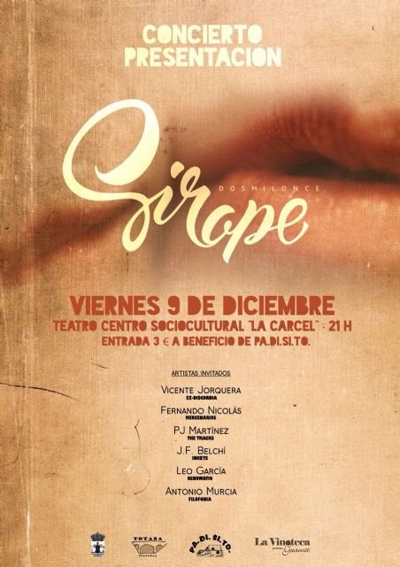 El próximo 9 de diciembre tendrá lugar la presentación en sociedad del grupo “Sirope”, cuyo concierto tendrá lugar en el Centro Sociocultural “La Cárcel” de Totana, a partir de las 21:00 horas.