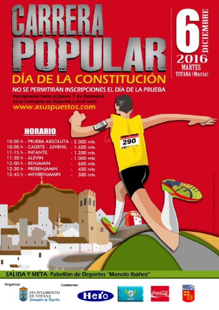 Ya son casi 30 los años que la Constitución Española se conmemora de la mejor forma en Totana, como así será por 29ª ocasión este próximo martes 6 de diciembre. El Pabellón de Deportes “Manolo Ibáñez” albergará la salida y meta de la XXIX Carrera Popular Día de la Constitución, a partir de las 10:00h. con el inicio de la prueba absoluta, sobre un recorrido aproximado de 5km., dando inicio posteriormente las pruebas infantiles.
