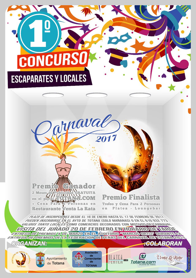 El I concurso de escaparates y locales de Carnaval Totana 2017 está organizado por la Federación de Peñas del Carnaval de Totana en colaboración con la Concejalía de Cultura del Ayuntamiento de Totana y la Asociación de Comerciantes de Totana.