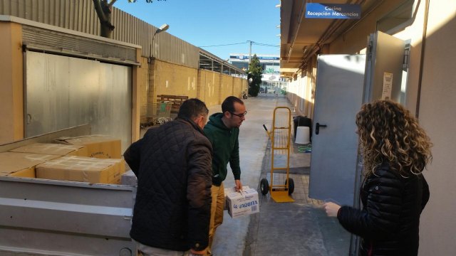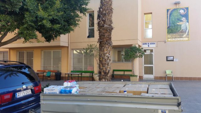 Los productos, traídos hasta las instalaciones del Centro de Acogida de Jesús Abandonado en Murcia, incluyen desde gel, champú, desodorante, toalllitas, agua de colonia o espuma de afeitar, hasta pasta, legumbres, arroz, leche, azúcar, aceite o conservas.