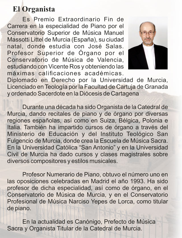 En la actualidad es Canónigo, Prefecto de Música Sacra y Organista Titular de la Catedral de Murcia.