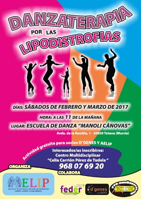 La Asociación de Familiares y Afectados de Lipodistrofias (AELIP) ha organizado, con la colaboración de la Asociación de Enfermedades Raras D´Genes, la Federación Española de Enfermedades Raras (FEDER) y la Escuela de Danza Manoli Cánovas, la actividad "Danzaterapia por las lipodistrofias", que tendrá lugar los sábados de febrero y marzo, a las once de la mañana.