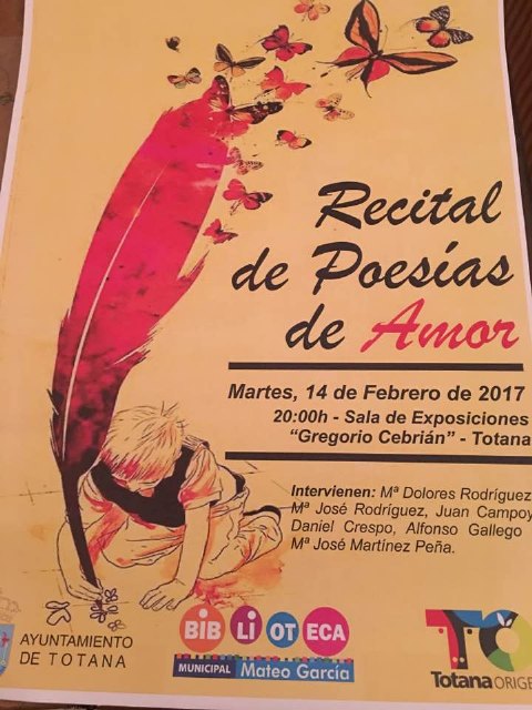 Totana Noticias La Sala de Exposiciones "Gregorio Cebrián" acogerá un Recital de Poesías de Amor el martes 14 de Febrero 03/02/2017 La Sala de Exposiciones "Gregorio Cebrián" acogerá un Recital de Poesías de Amor el martes 14 de Febrero Fuente: Totana.com