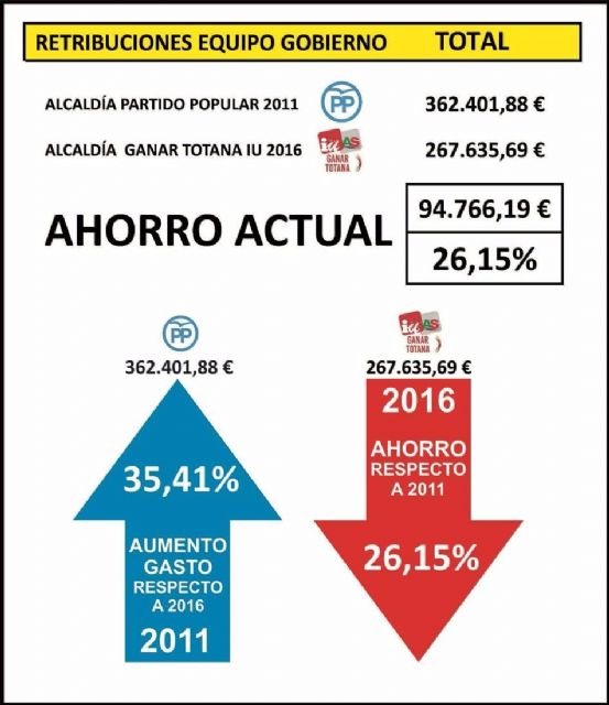"De esta forma y con cifras oficiales, se le desmonta otro "caballo de batalla" al Partido Popular. Si durante el transcurso de la legislatura, los hemos oído y leído en diferentes medios de comunicación enarbolando el discurso de "los sueldos y los sillones", ahora podemos demostrar que mentían al decir que se había aumentado el gasto en retribuciones a políticos. En el año 2011, gobernado por el PP, se destinaron 362.401€ a cubrir las retribuciones del personal político del Ayuntamiento. En el año 2016, ostentando la alcaldía Ganar Totana IU, se reduce esa cifra en casi 95.000€."