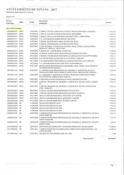 Me atrevería a afirmar que los gastos superan con crecen el millón de euros que no es "una binza de tomate". Para muestra, y como esos cientos de miles, han salido de nuestros atormentados bolsillos, los publico para conocimiento de los paganos de impuestos para que se compruebe como se pagaron a "Expertos Consultados" para nada, por un Plan General todavía en el alero.