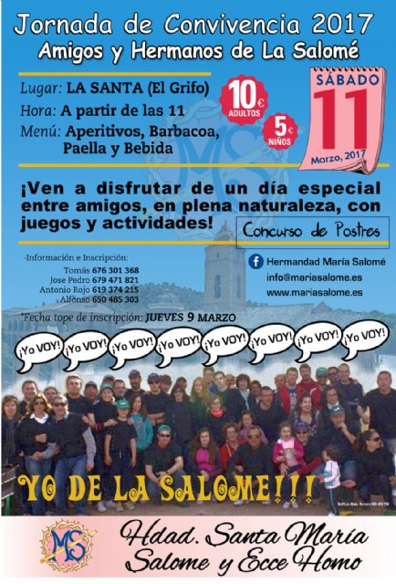 Sábado 11 de Marzo: A partir de las 11.00h en la Santa (el grifo de las monjas) disfrutaremos de una jornada de convivencia para amigos y hermanos de la hermandad. Precio 10€ adultos y 5€ niños, incluye: aperitivo, barbacoa, paella y bebidas. Reserva tu plaza antes del jueves 9 de Marzo en los lugares y contactos habituales.