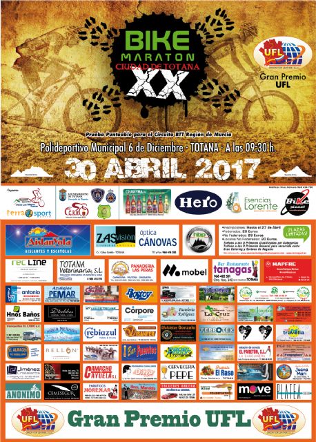 Por un lado, el domingo 30 de abril, contaremos con la XX Bike Maraton ciudad de Totana. Prueba puntuable para el nuevo Circuito de BTT de la Región de Murcia. Tanto la salida como la meta serán ubicadas en el Polideportivo Municipal 6 de diciembre.