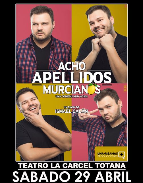 El espectáculo "Acho apellidos murcianos" llega este próximo sábado, 29 de abril, a partir de las 21:15 horas, al teatro del Centro Sociocultural "La Cárcel" organizado por la Concejalía de Festejos del Ayuntamiento de Totana, un show ácido que interpreta el monologuista Ismael Galán.
