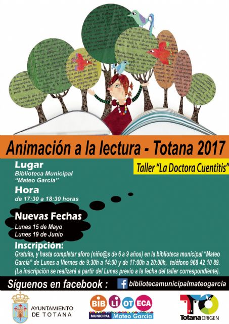 La Concejalía de Cultura, a través de la Biblioteca Municipal "Mateo García", ha abierto el plazo para inscribirse en el Taller de Animación a la Lectura "Doctora Cuentitis" que se celebrará el 15 de mayo y 19 de junio, respectivamente, de 17:30 a 18:30 horas, en la biblioteca pública.