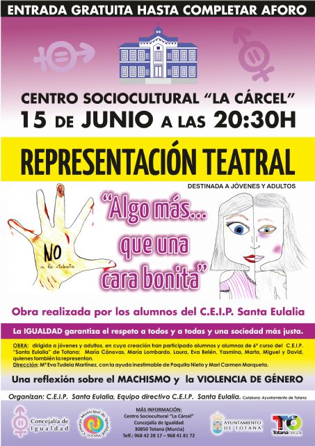 Alumnos del CEIP "Santa Eulalia" de Totana van a representar el próximo 15 de junio la obra de teatro "Algo más…que una cara bonita", en le Centro Sociocultural "La Cárcel", a partir de las 20:30 horas; una reflexión sobre el machismo y la violencia de género.