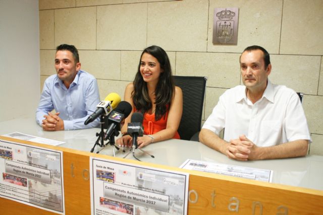 La concejal de Deportes, Isabel María Molino, el presidente de la Federación Murciana de Tenis de Mesa, Francisco Reina, y el presidente del Club Totana Tenis de Mesa, Domingo Méndez, presentaron esta edición del campeonato autonómico masculino y femenino.