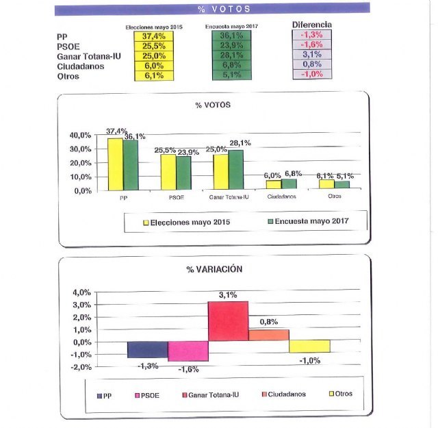Según el Estudio Sociológico, de celebrarse Elecciones Municipales en esos días, el Partido Popular tendría un apoyo del 36,1%, Ganar Totana IU, el 28,1%, el PSOE del 23,9%; Ciudadanos, un 6,8%; Otros, un 5,1% y la abstención se elevaría al 39,3% del 32,8% en los comicios de mayo 2015. Con estos resultados, el PP mantendría sus 8 asientos en el Pleno y el PSOE retrocedería 1 regidor que aumentaría Ganar Totana IU, pasando a 7 escaños. Ciudadanos mantendría el actual concejal, elevando su porcentaje en votos.