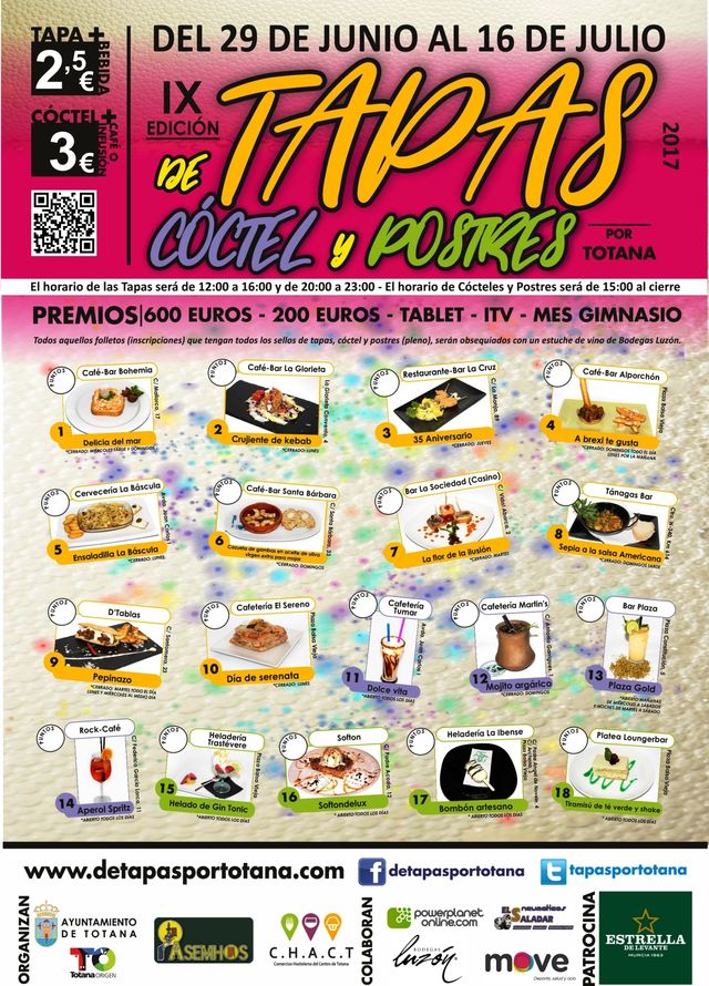 La IX Ruta de Tapas, el Cóctel y Postres por Totana se celebrará desde hoy 29 de junio hasta el 16 de julio en dieciocho establecimientos de esta localidad, coincidiendo con la celebración del programa de fiestas patronales de Santiago.