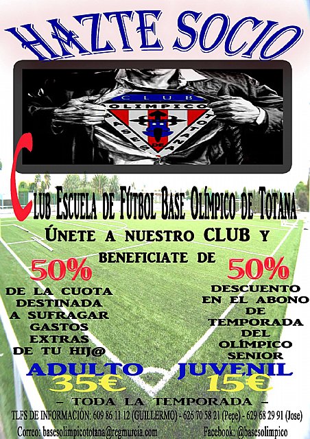 Hacerte socio del Club E. F. Base Olímpico de Totana supone promover, fomentar y apoyar a aquellos chicos y chicas de nuestra localidad que disfrutan practicando deporte y portando el nombre de nuestro "Glorioso" y de nuestro pueblo por los distintos rincones de nuestra región.
