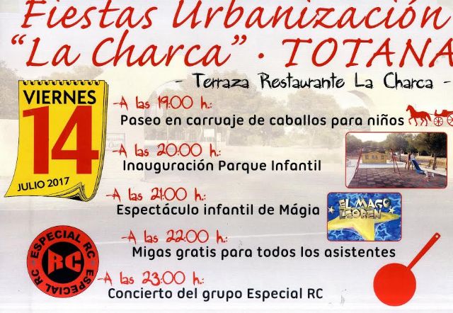 Las fiestas de la urbanización "La Charca" de Totana se celebrarán, por vez primera, el próximo viernes, 14 de julio, y nacen con vocación de continuidad, organizadas por la Asociación de Vecinos de esta urbanización.