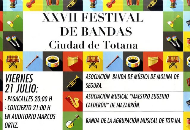 El XXVII Festival de Bandas "Ciudad de Totana" tendrá lugar el viernes 21 de julio con motivo del programa de actividades culturales de las fiestas patronales de Santiago, recuperándose así una iniciativa que no se celebraba desde el año 2011 y organizada por la Agrupación Musical de Totana.