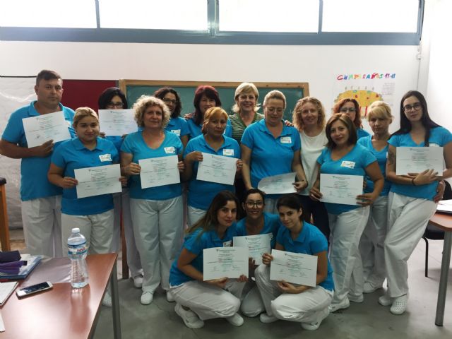 Alumnos del programa mixto de empleo y formación de "Atención Sociosanitaria a Personas Dependientes en Institucionales Sociales" han recibido recientemente de manos de la concejal de Programas Formativos del Ayuntamiento de Totana, Antonia Camacho, los diplomas del "Curso de Manipulador de Alimentos", de 8 horas de duración que se celebró en las dependencias del Centro de Desarrollo Local de Totana.