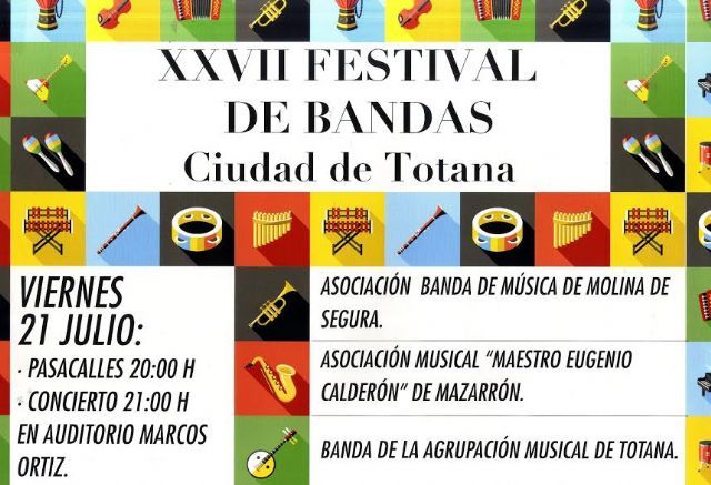 El festival contará con la participación de tres bandas de música, y la entrada es gratuita. Los grupos participantes son la Asociación de la Banda de Música de Molina de Segura, la Asociación Musical "Maestro Eugenio Calderón" de Mazarrón y la anfitriona la Banda de la Agrupación Musical de Totana.