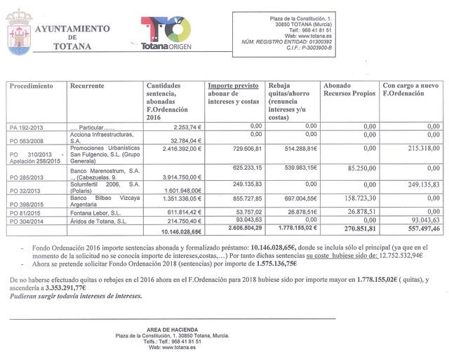 En el punto número 13 del Pleno de Julio, se debatió la "propuesta de Alcaldía con objeto de aprobar el Plan de Ajuste necesario para el 2018", con el fin de acogernos al Fondo de Ordenación para financiar el abono de Sentencias Judiciales en firme a las que ha sido condenado el Ayuntamiento de Totana por un total de 1.575.136€.