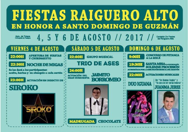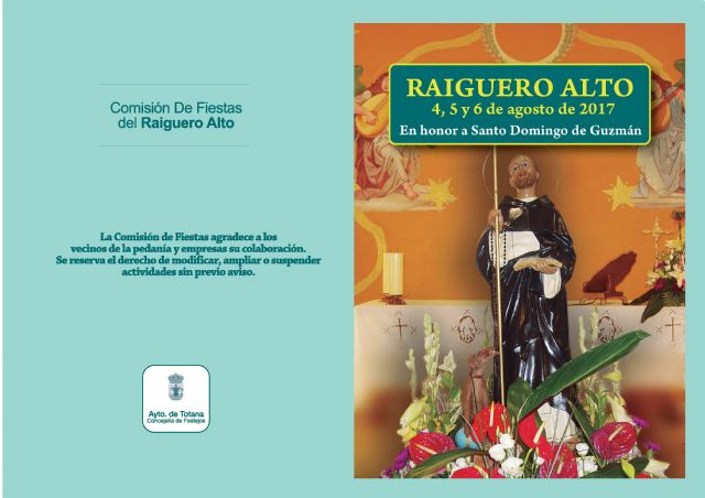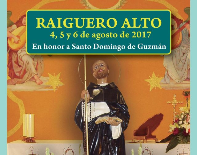 Las fiestas en la diputación de El Raiguero Alto, en honor a Santo Domingo Guzmán, se celebrarán del 4 al 6 de agosto, y con ellas arrancan, junto con las de La Costera Ñorica, el programa de festejos en barrios y pedanías del mes de agosto en este municipio.