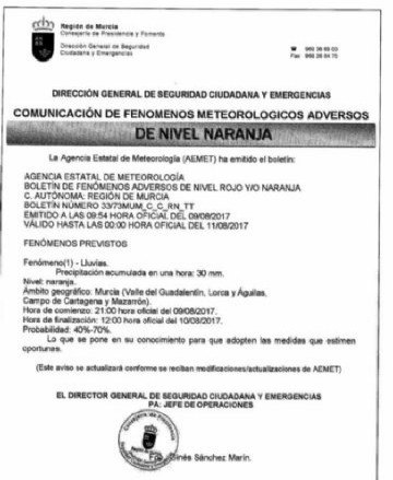 La Agencia Estatal de Meteorología (Aemet) ha elevado a naranja el aviso por lluvias con la previsión de que se acumulen en una hora hasta 30 litros por m² en el Campo de Cartagena y Mazarrón, Valle del Guadalentín, Lorca y Águilas. Se prevé que comience a las 21.00 horas de este miércoles y concluya a las 12.00 horas de este jueves.