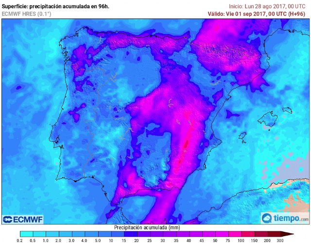 Precipitación acumulada durante los últimos cuatro días de agosto (28-31) según el modelo europeo. Es una de tantas previsiones, pero nos sirve para hacernos una idea.