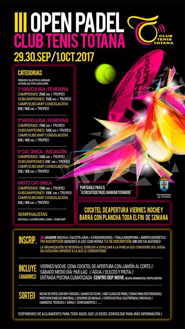El fin de semana del 29 de Septiembre al 1 de Octubre tendrá lugar en Totana el III Open de Padel club de tenis Totana, una prueba que en sus dos ediciones anteriores ya se desmarcó como un evento indispensable a nivel regional,no solo por el nivel de juego, ya que acuden jugadores desde todos los puntos de la Región y provincias cercanas, sino por el buen ambiente que se vive durante todo el fin de semana en las instalaciones del club de tenis. Servicio de barra con plancha, bebidas y cócteles acompañan al deporte en unas jornadas divertidas donde hermanamiento y competición son uno, tal y como destacan desde el club en un comunicado.
